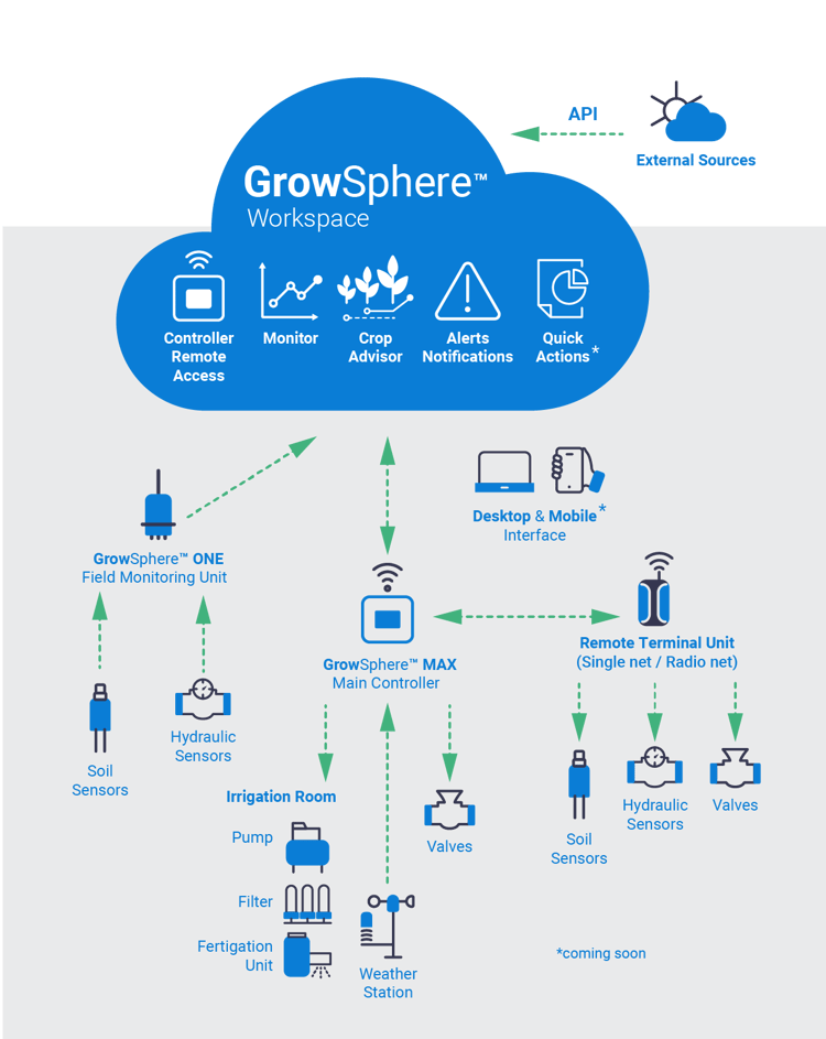 C'est pourquoi nous avons créé GrowSphere™, le premier système d'exploitation (OS) pour l'irrigation de précision. Un outil de travail simple, intuitif et visuel qui vous aide à planifier et à exécuter vos plans d'irrigation avec plus de fiabilité, de transparence et moins d'efforts.
